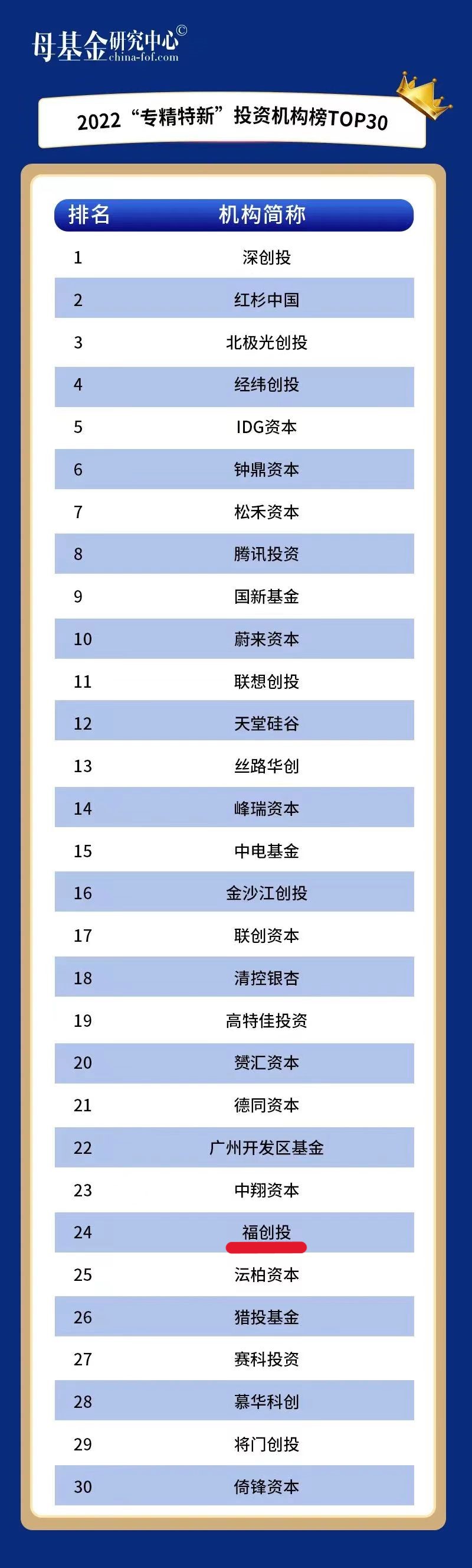 11月12日,母基金研究中心(www.china-fof.com)根據(jù)已有數(shù)據(jù)支撐與研究分析,對外發(fā)布2022年度專項榜單。福創(chuàng)投憑借近年來在培育專業(yè)化、精細(xì)化、特色化、新穎化中小企業(yè)方面的優(yōu)異表現(xiàn),榮登2022“專精特新”投資機(jī)構(gòu)榜TOP30。