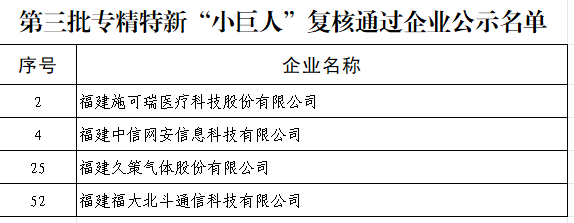 近日,國家工業(yè)和信息化部開展了第六批專精特新“小巨人”企業(yè)培育和第三批專精特新“小巨人”企業(yè)復(fù)核工作,已完成相關(guān)審批并予以公示。福創(chuàng)投已投企業(yè)福建海西新藥創(chuàng)制股份有限公司入圍第六批專精特新“小巨人”企業(yè)公示名單,福建施可瑞醫(yī)療科技股份有限公司、福建中信網(wǎng)安信息科技有限公司、福建久策氣體股份有限公司、福建福大北斗通信科技有限公司入圍第三批專精特新“小巨人”復(fù)核通過企業(yè)公示名單。